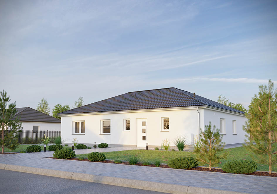 Winkelbungalow, Walmdach 25°, überdachte Terrasse
